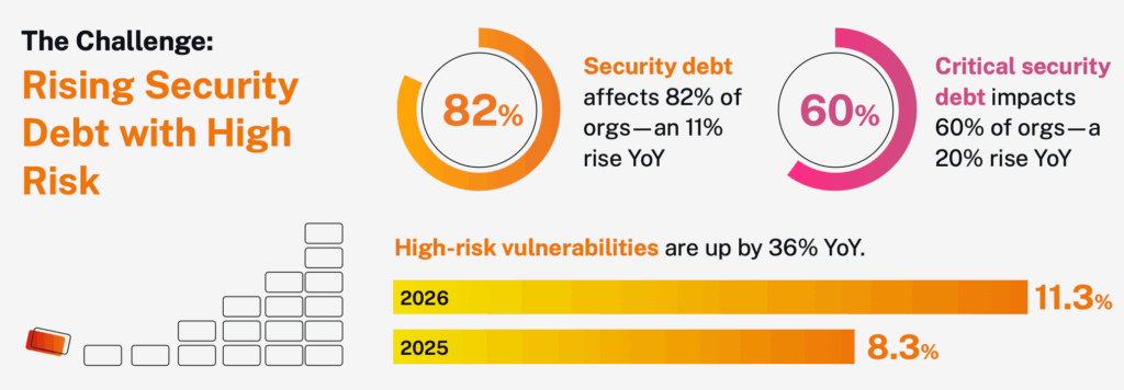 - Critical security debt impacts 60% of organizations. This is a 20% relative increase from 2025.