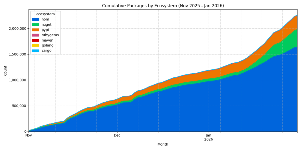 Over Christmas, in general the malware authors also took a break and, as far as I recall, nothing significant occurred. I was expecting another worm, but that has yet to materialise. What I have found is that since the new year I feel the pressure from the ever-growing pile of NPM packages to look through, which continues to grow: