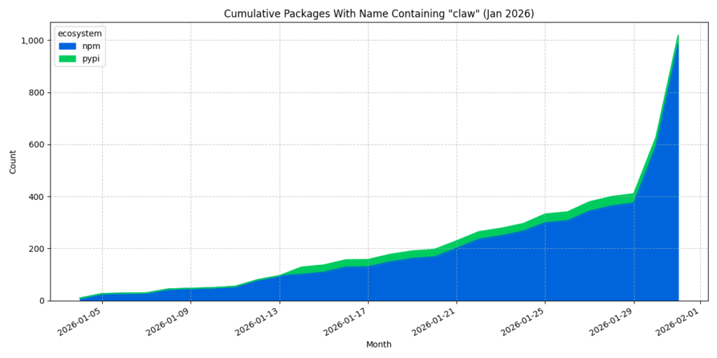 I wonder how much of the new package volume has to do with OpenClaw, and so if we filter by packages with “claw” in the name this is what it looks like: