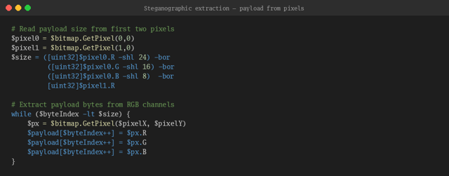 The steganographic algorithm is simple but effective. The first two pixels encode the payload size as a 32-bit unsigned integer: