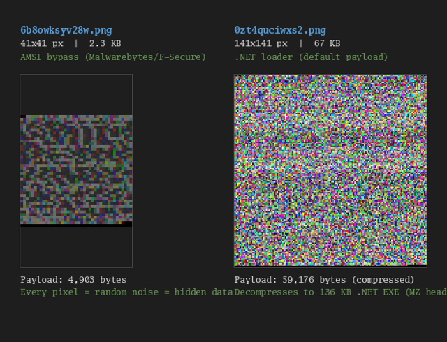 The smaller image (41×41 pixels, 2.3 KB) contains a 4,903-byte PowerShell script, itself obfuscated with character-by-character concatenation. After deobfuscating, it’s appears to be a AMSI memory patch.