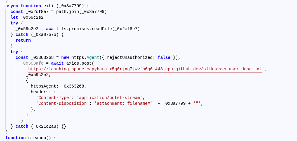 We think the intent was to have this script execute during a build of a GitHub-owned repository, exfiltrate the tokens available to the build environment, and then use those tokens to publish new malicious artifacts as GitHub.