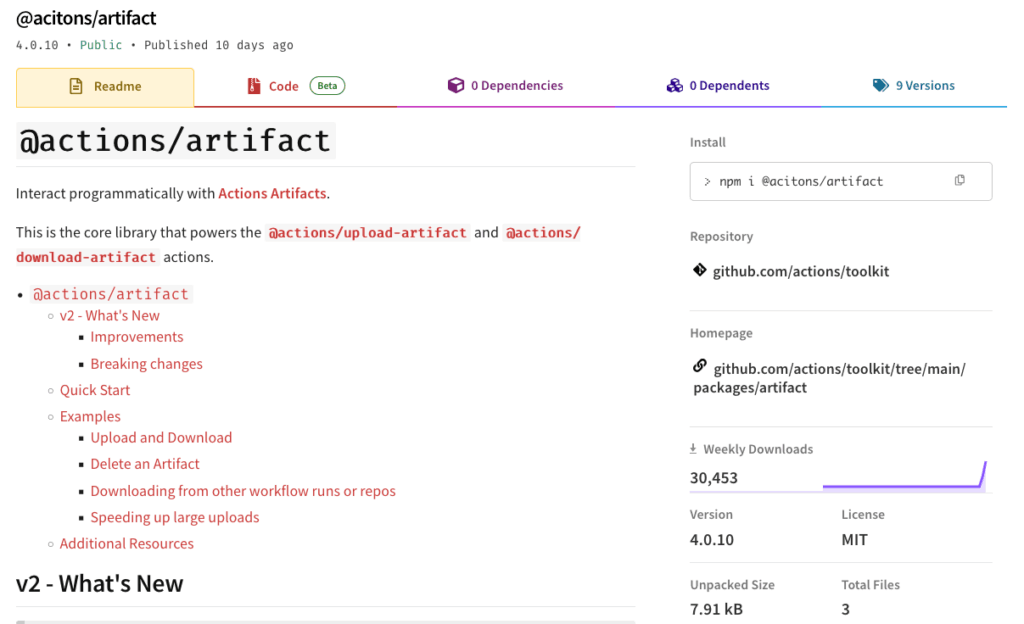 The package states it is for the GitHub Actions Toolkit, which has a legitimate npm package @actions/artifact. Therefore this malware package is a clear typosquat with the swapping of the letters “ti” for “it”.