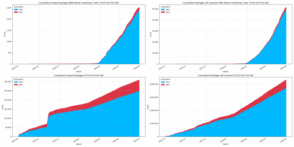 The end January marked the beginning of a new era of personal AI assistants; namely OpenClaw. With that we noticed an immediate and exponential volume of packages featuring the word “claw” in their name in the NPM ecosystem, and to a lesser extent within the PyPI ecosystem. Whilst claw has it’s own skills marketplace (ClawHub), it is interesting to see these types of packages to be distributed in the NPM ecosystem.