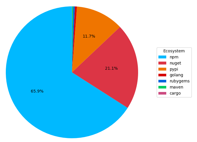 It shouldn’t be a surprise that the NPM ecosystem continues to be the most active with 65.9% of the packages we see. This is a trend we have been seeing for some years now and whilst we are seeing increased package volume in all ecosystems, NPM is growing the fastest.