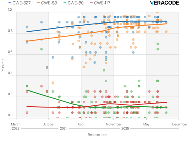 - Cryptographic Algorithms (CWE-327): Results remain strong industry-wide, with over 85 percent of tasks passing.