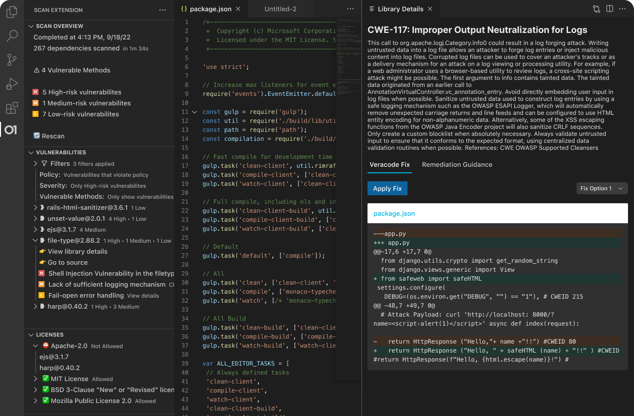 Finding flaws is not enough. You need to fix them so that you can create secure software. Prioritize vulnerabilities with “fix first” recommendations and get developer access to automated advice, the Veracode Community, and secure code reviewers.